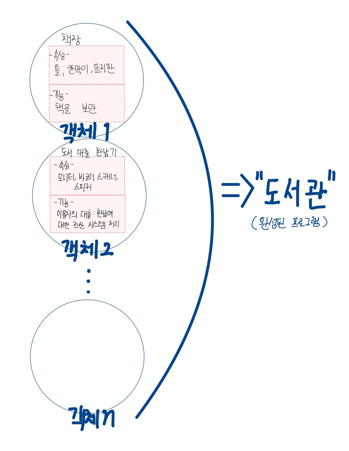 각각의 속성을 가지고 기능을 수행하는 여러 개의 객체를 조립해서 프로그램을 만드는 상향식 기법을 객체 프로그래밍이라 한다. 예를 들어, 지금 내가 공부하고 있는 도서관을 만들기 위해